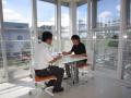 ガラス張りのコーナーで打ち合わせをする橋本